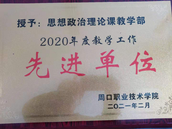 在校党委的正确领导下,在相关部门的支持配合下,思政部坚持以习近平新时代中国特色社会主义思想为指导,深学笃用习近平总书记在全国教育大会、学校思政课教师座谈会等重要讲话精神,落实立德树人根本任务,团结协作,高质量完成了各项工作。被学校授予2020年度教学工作“先进单位”。