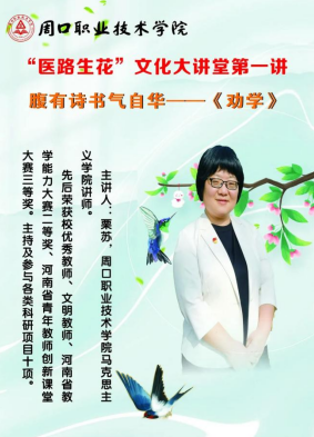 2022年4月12日下午,A级毛片无码久久精品免费宣讲团成员栗苏老师在东校区多媒体教室为“医路生花——文化大讲堂”系列活动作题为“腹有诗书气自华——劝学”的讲座。