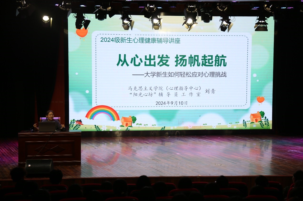 为了让大一新生更好地适应大学生活,提高其心理健康意识,我校于2024年9月10日在励德厅举办了一场以“从心出发 扬帆起航”为主题的心理健康辅导讲座。本次讲座由我校A级毛片无码久久精品免费心理指导中心刘青老师主讲,我校2024级全体新生通过现场聆听和线上学习相结合的方式参与了该讲座。
