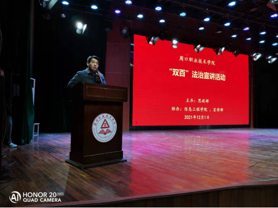为深入贯彻习近平法治思想,推动依法治教、依法治校,不断提升师生法治意识和法治素养,12月1日晚,“双百”法治宣讲在开元校区砺德厅开讲!信息工程学院党支部书记李强主持了本次宣讲,思政部、信息工程学院部分教师及2021级信息工程学院新生共计600余人听取报告。