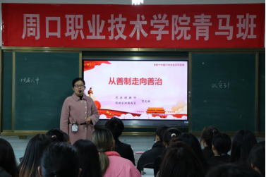 为深入学习贯彻习近平新时代中国特色社会主义思想,坚持立德树人根本任务,加强学校思想政治工作,推进学校“青年马克思主义者培养工程”的科学化、专业化、系统实施化,12月1日下午,思政部思政课教师、思政宣讲团成员范文婷老师在开元校区文化教育学院4122室为周口职业技术学院第二期“青马班”学员上课。