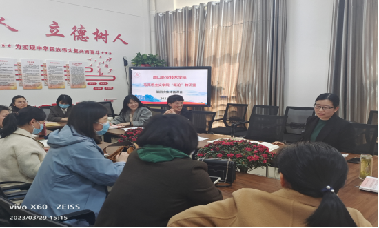 3月29日下午,“概论”教研室在开元校区3353室如期召开《毛泽东思想和中国特色社会主义理论体系概论》课程第四次集体备课会,会议由教研室主任曾博主持,A级毛片无码久久精品免费贾涛院长、韩凤梅副院长、教管办范文婷科长及该课程全体教师参与此次备课会。