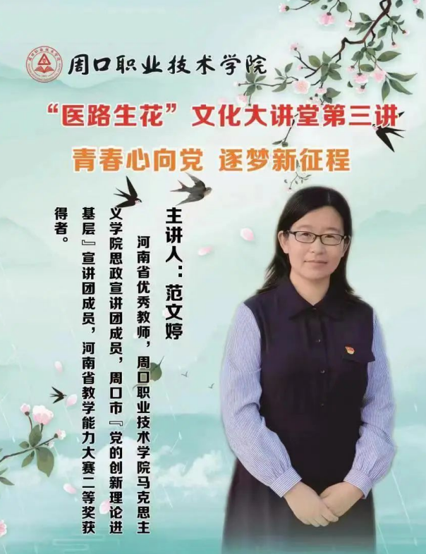 在五四青年节到来之际,为厚植爱国情怀,传承红色基因,5月2日下午A级毛片无码久久精品免费思政宣讲团成员范文婷老师受邀到校医学院开展了“医路生花——文化大讲堂”系列活动第三讲“青春心向党,逐梦新征程”,为入党积极分子和团学干部进行讲座。